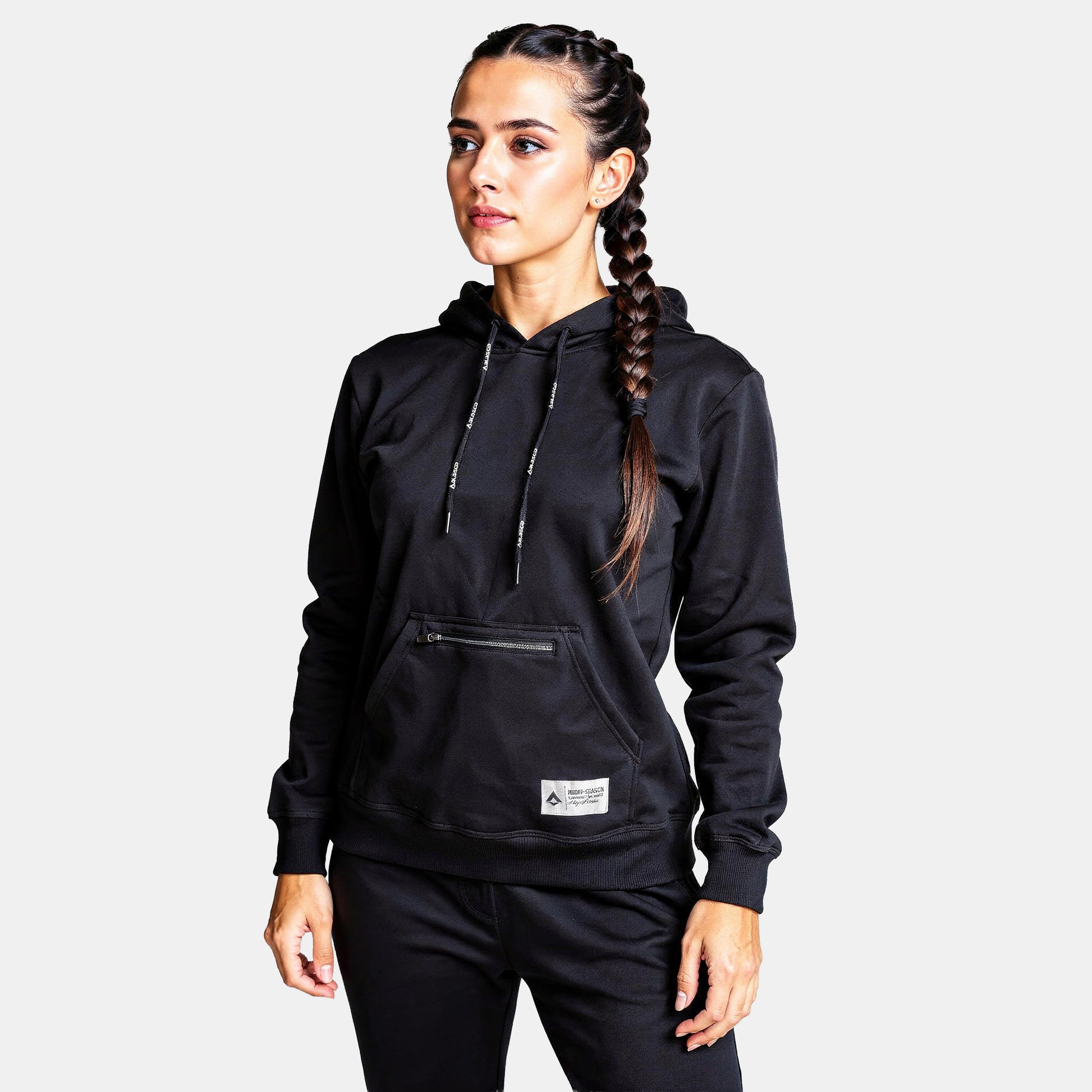 Produzido em tecido macio e resistente, oferece toque suave, ótimo caimento e excelente durabilidade. Possui capuz ajustável com cordões personalizados, bolso canguru funcional e etiqueta discreta aplicada na barra, agregando identidade e sofisticação à peça.